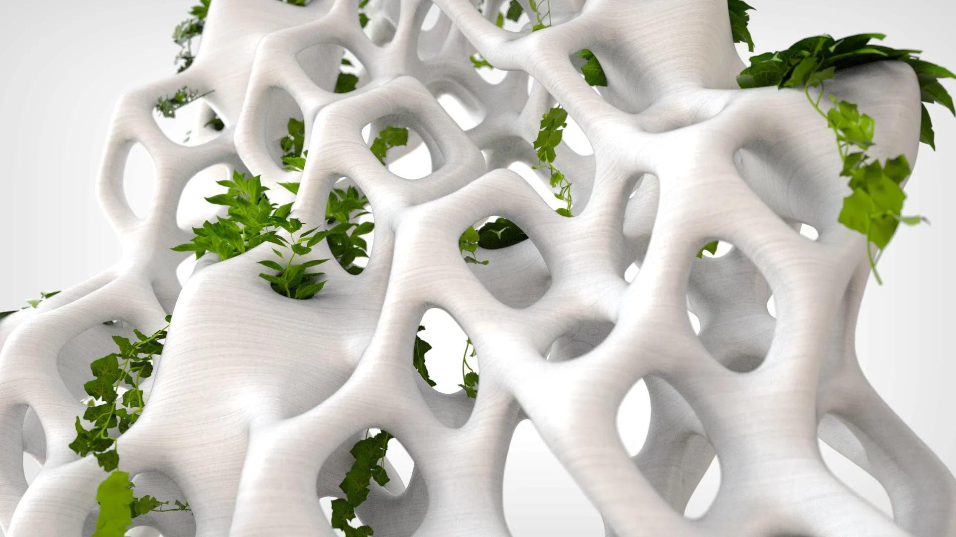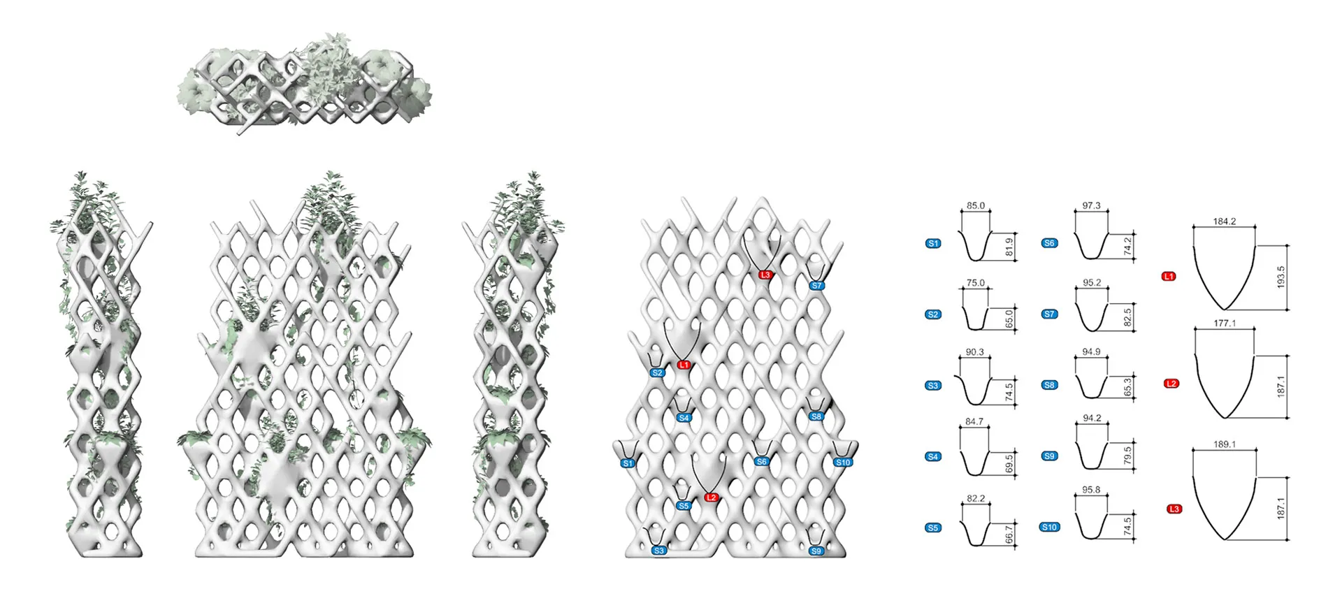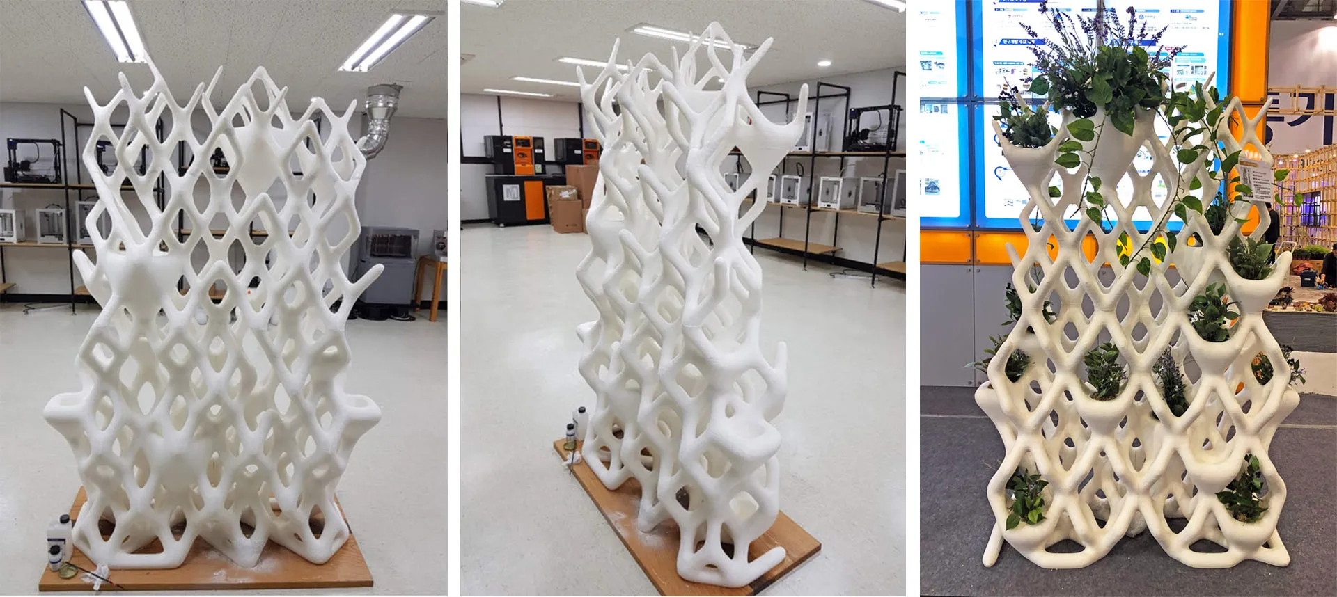 3D 프린팅 공법을 활용하여 제작 가능한 3D 래티스(Lattice) 구조의 파티션 벽체이다. 단위 셀의 부피를 활용해 화분 기능을 겸할 수 있도록 디자인되었다. 아이비나 담쟁이덩굴 같은 식물이 구조를 감고 자라기에 최적화된 형태이며, 출력 시 별도의 지지 구조(Support) 없이도 안정적인 조형이 가능한 각도로 설계되었다. 래티스 구조는 화분의 위치 설정과 심미적 표현을 위해 일부 라인을 랜덤하게 삭제하였으며, 높이에 따라 구조체의 직경이 자연스럽게 변화하도록 구현하였다. 모델링 과정에서는 Grasshopper의 Voxel 모델링 애드온인 Dendro를 활용하였다. 스케일 모델과 1:1 실물 모델은 모두 FDM 방식의 3D 프린터로 제작되었으며, 설계 단계부터 출력 각도를 정교하게 고려하여 서포트 없이 성공적으로 출력하였다. This partition wall is designed as a 3D lattice structure optimized for 3D printing, utilizing the volume of unit cells to function as a planter. Designed for climbing plants such as ivy and creeper to grow around, the lattice structure was engineered with specific self-supporting angles to allow for printing without the need for support structures. Certain lines within the lattice were randomly removed for aesthetic expression and planter placement, with the structural diameter naturally varying according to height. Dendro, a Voxel modeling add-on, was utilized within the Grasshopper 3D modeling environment. Both the scale model and the 1:1 model were produced using FDM-type 3D printers; because the design accounts for the printer's overhang limits, it was successfully printed without any supports.