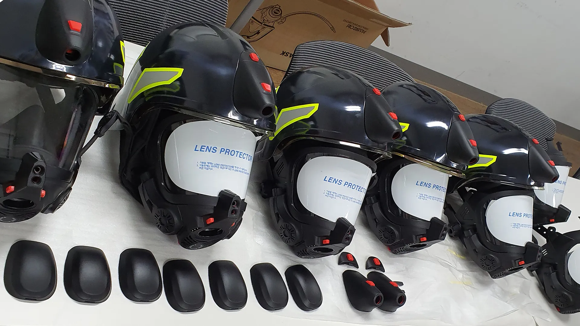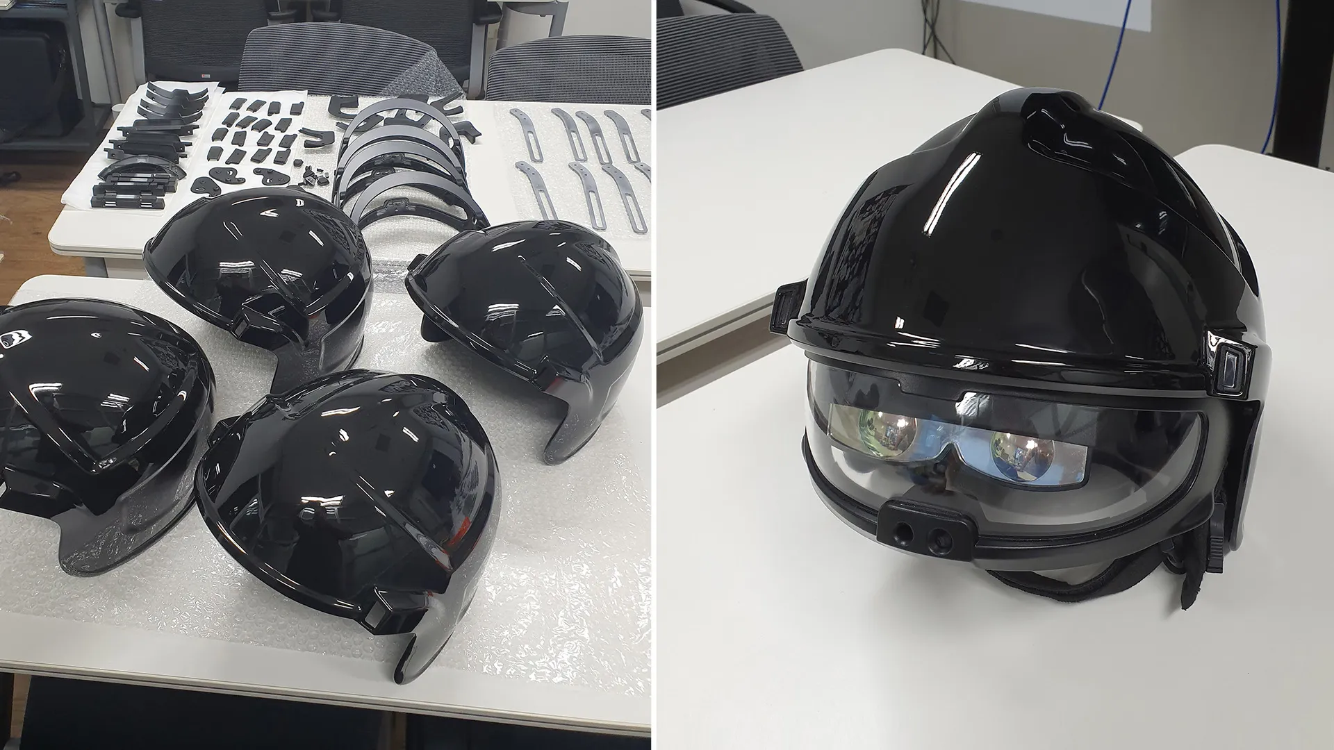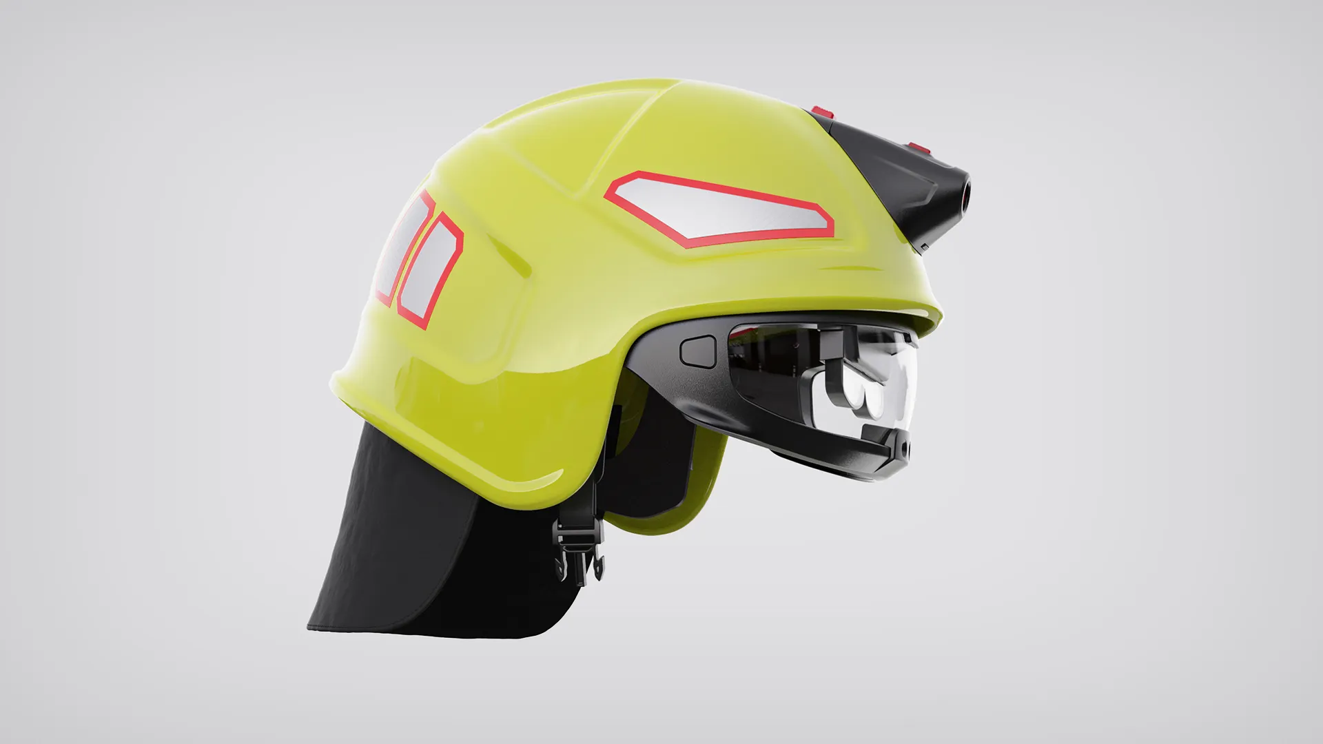 한컴라이프케어에서 개발한 스마트 소방 헬멧으로, HMD를 활용한 AR 디스플레이, 화점 및 요구조자 탐지가 가능한 EO/IR 카메라, LED 라이트, 통신 모듈 등이 내장되어 있어 보다 효율적인 소방/구조 활동이 가능하게 도와준다. This smart firefighting helmet, developed by Hancom Lifecare, is equipped with an AR display utilizing HMD, EO/IR cameras for detecting fire sources and victims, LED lights, and communication modules. These integrated features facilitate more efficient firefighting and rescue operations in critical environments.