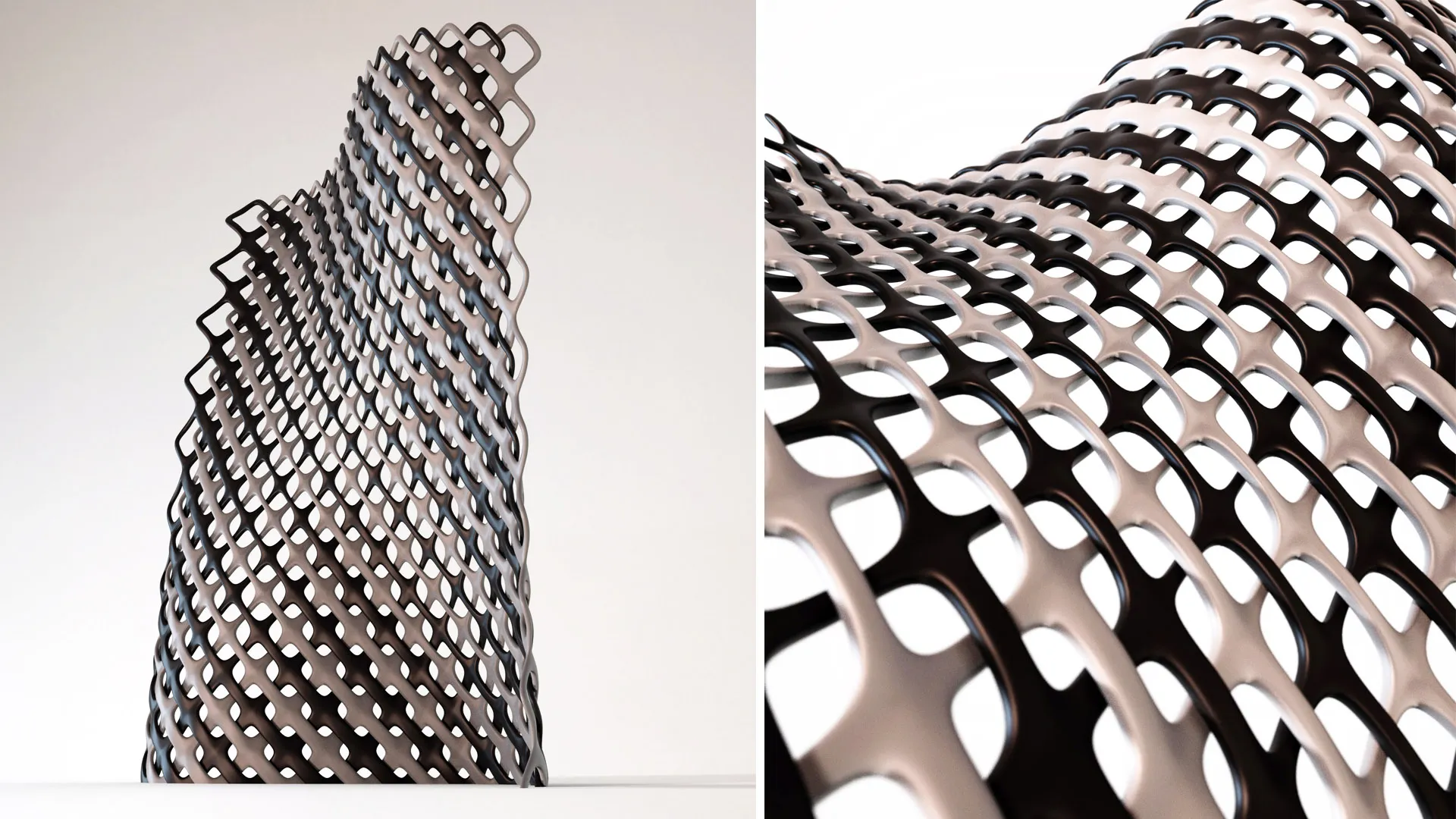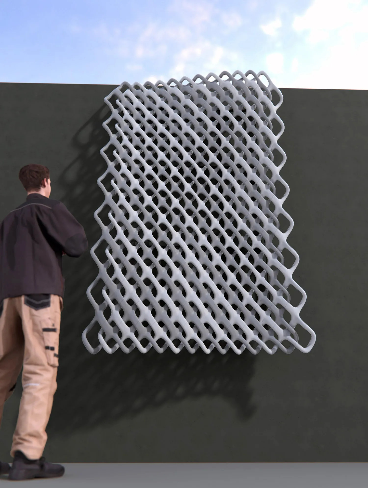 바인더 제트(Binder Jet) 방식의 건축용 3D 프린팅 개발을 위한 블록 모듈 조립형 외장재 디자인이다. 두 개의 다이아그리드를 중첩한 패턴을 바탕으로 단위 모듈의 굵기 변화를 이용하여 KCL의 이니셜인 'K'자를 형상화하였다. 3D 프린팅 목업은 콘크리트 재질로 출력한 블록과 HP 젯퓨전을 이용한 플라스틱 블록을 조합하여 프로토타입 모델로 제작되었다. This is a block-module assembly facade design developed for Binder Jet architectural 3D printing. It features a pattern of two overlapping diagrids, utilizing variations in the thickness of unit modules to represent the letter 'K', the first initial of KCL. The 3D-printed mockup was produced as a prototype model by combining blocks printed in concrete with plastic blocks created using HP Multi Jet Fusion.