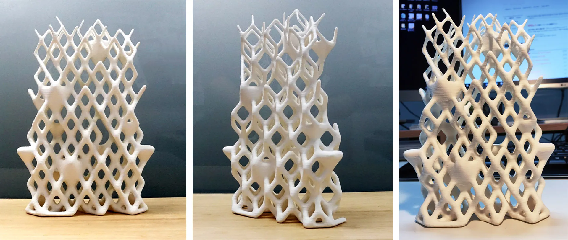 3D 프린팅 공법을 활용하여 제작 가능한 3D 래티스(Lattice) 구조의 파티션 벽체이다. 단위 셀의 부피를 활용해 화분 기능을 겸할 수 있도록 디자인되었다. 아이비나 담쟁이덩굴 같은 식물이 구조를 감고 자라기에 최적화된 형태이며, 출력 시 별도의 지지 구조(Support) 없이도 안정적인 조형이 가능한 각도로 설계되었다. 래티스 구조는 화분의 위치 설정과 심미적 표현을 위해 일부 라인을 랜덤하게 삭제하였으며, 높이에 따라 구조체의 직경이 자연스럽게 변화하도록 구현하였다. 모델링 과정에서는 Grasshopper의 Voxel 모델링 애드온인 Dendro를 활용하였다. 스케일 모델과 1:1 실물 모델은 모두 FDM 방식의 3D 프린터로 제작되었으며, 설계 단계부터 출력 각도를 정교하게 고려하여 서포트 없이 성공적으로 출력하였다. This partition wall is designed as a 3D lattice structure optimized for 3D printing, utilizing the volume of unit cells to function as a planter. Designed for climbing plants such as ivy and creeper to grow around, the lattice structure was engineered with specific self-supporting angles to allow for printing without the need for support structures. Certain lines within the lattice were randomly removed for aesthetic expression and planter placement, with the structural diameter naturally varying according to height. Dendro, a Voxel modeling add-on, was utilized within the Grasshopper 3D modeling environment. Both the scale model and the 1:1 model were produced using FDM-type 3D printers; because the design accounts for the printer's overhang limits, it was successfully printed without any supports.