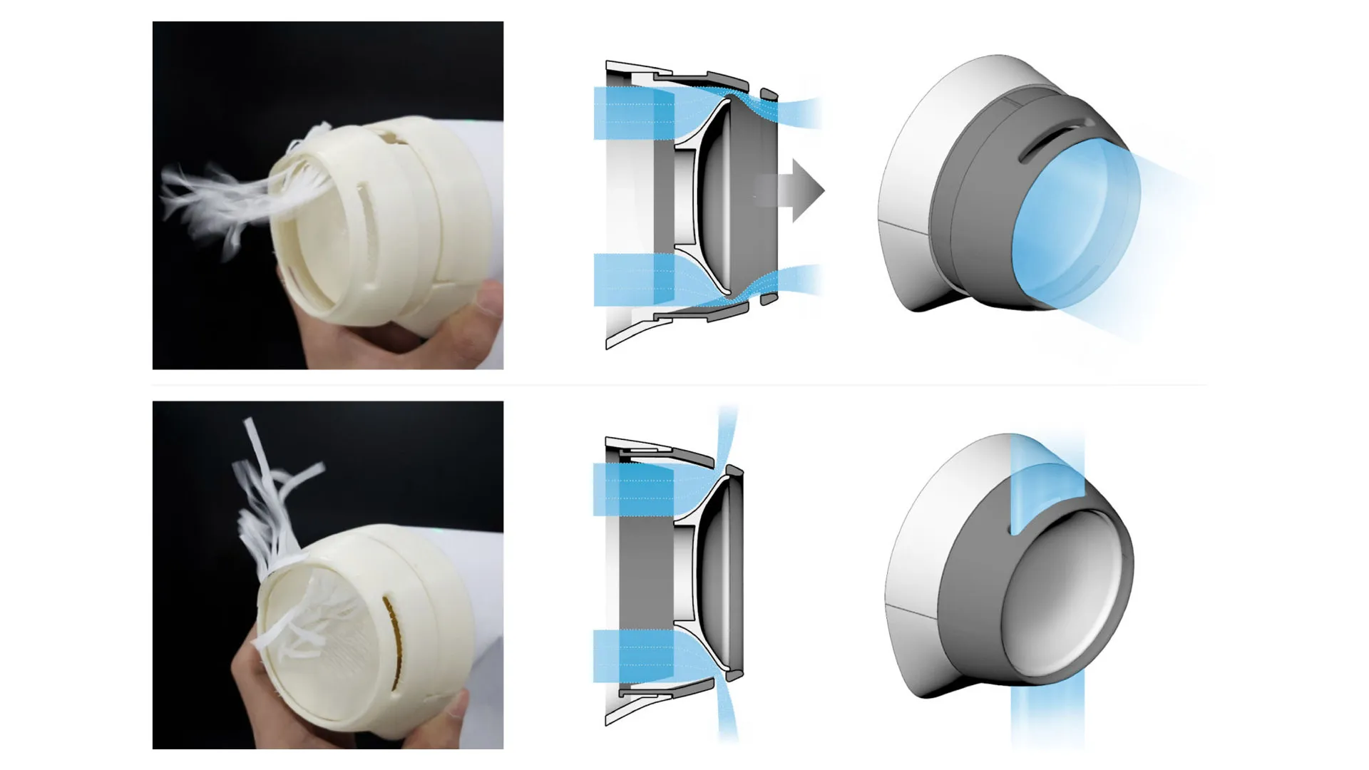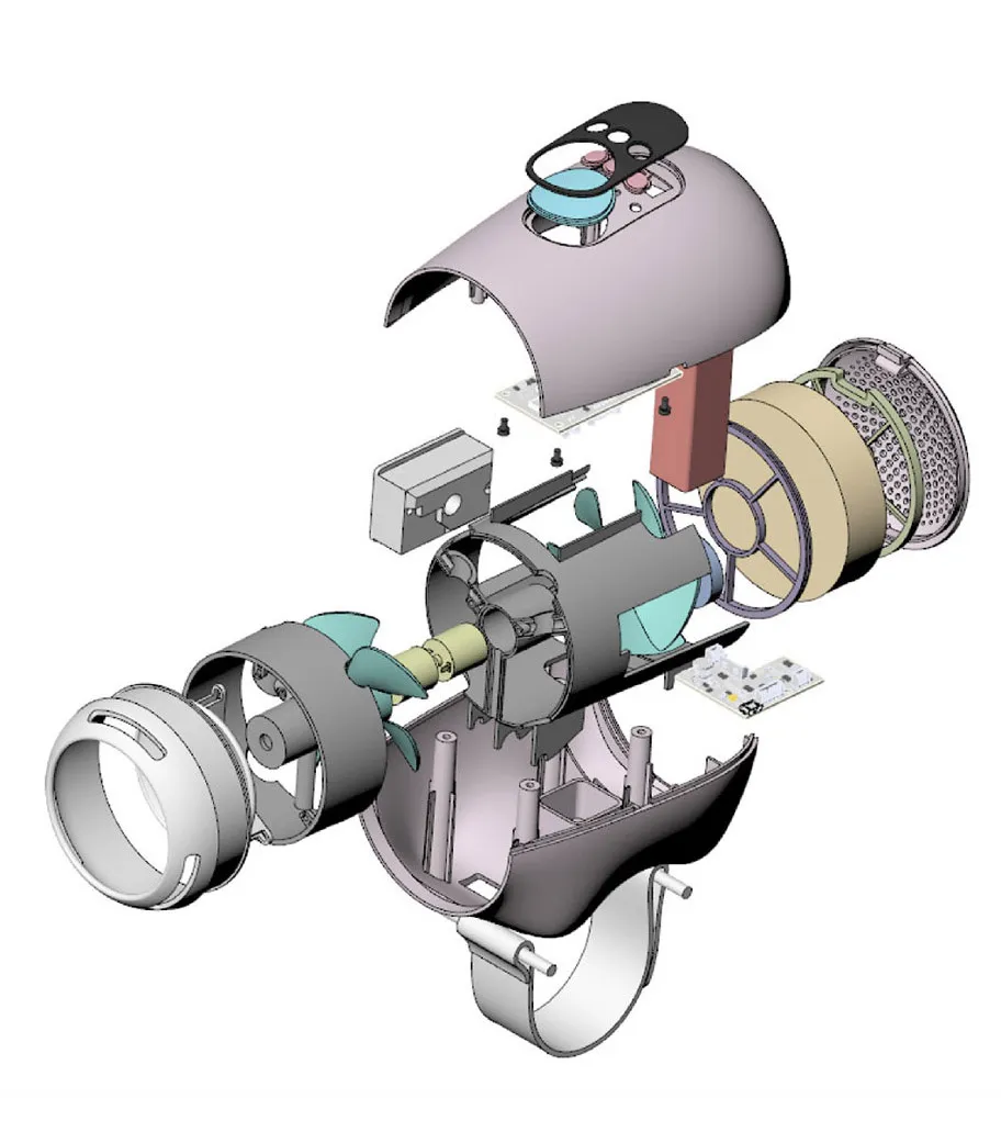 아이의 얼굴 방향으로 바람이 가기 때문에 풍량뿐만 아니라 풍향 조절 기능이 필수적이다. 이를 위해 전면 파트를 슬라이딩 방식으로 이동시켜 풍향을 제어하는 구조를 설계하였으며, 3D 프린팅을 활용한 반복적인 테스트와 개선 과정을 거쳐 간단한 조작만으로 직/간접풍을 자유롭게 선택할 수 있도록 구현하였다. Given its proximity to the child, precise control of both airflow volume and direction was essential. This was achieved by incorporating a sliding front mechanism that allows for intuitive adjustments. Through extensive prototyping and refinement using 3D printing, the final design enables users to easily switch between direct and indirect airflow with simple manual adjustments.