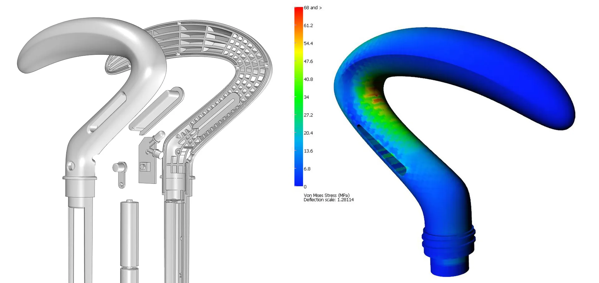 LED 안전등과 야간 시야 확보를 위한 전등을 장착하여, 교통사고 및 안전사고를 예방할 수 있도록 설계된 카본 소재의 스마트 지팡이이다. 디자인의 구조적 강성을 검증하기 위해 유한 요소 분석(FEA) 테스트를 진행하였으며, 제품의 경량화와 최적의 무게 중심을 고려하여 내부 설계를 완성하였다. This carbon fiber smart cane is equipped with LED safety signals and a headlight for enhanced visibility, designed to prevent traffic and pedestrian safety accidents at night. We conducted Finite Element Analysis (FEA) to validate the structural rigidity of the design and performed internal engineering to achieve an optimized weight for the final product.