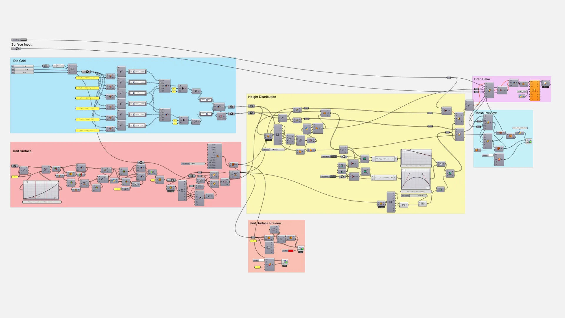 기본 단위 서피스의 제어점(Control point) 위치는 그래프 매퍼(Graph Mapper)를 사용하여 조절할 수 있으며, 이를 통해 다이아그리드를 다양한 3D 형상으로 변형할 수 있습니다.