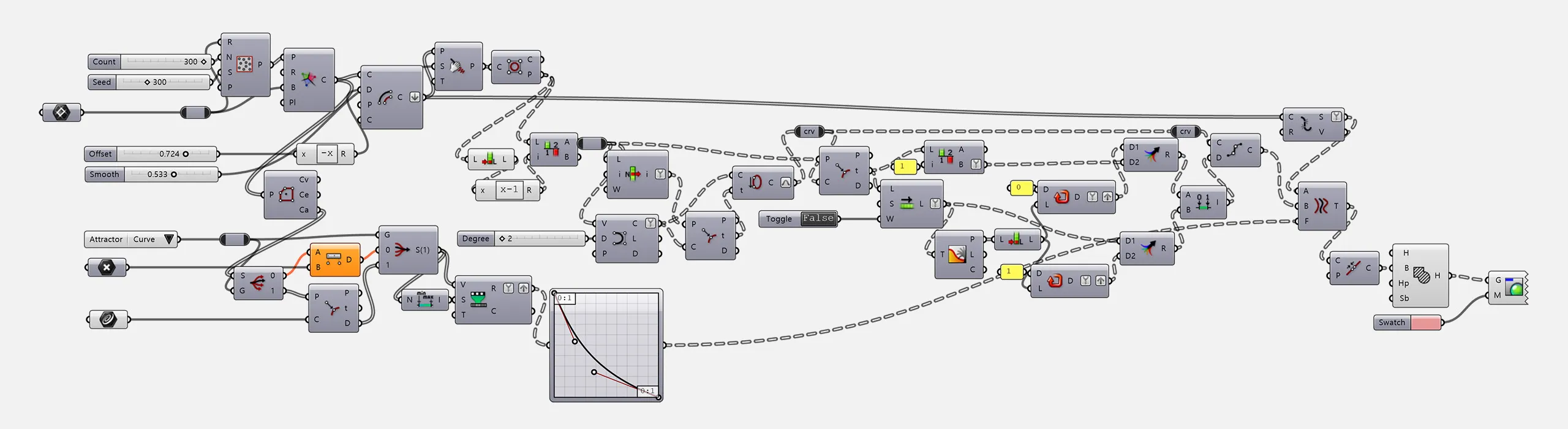 포인트 또는 커브를 어트랙터로 사용하고 Graph Mapper를 통해 변형의 정도를 제어할 수 있습니다.