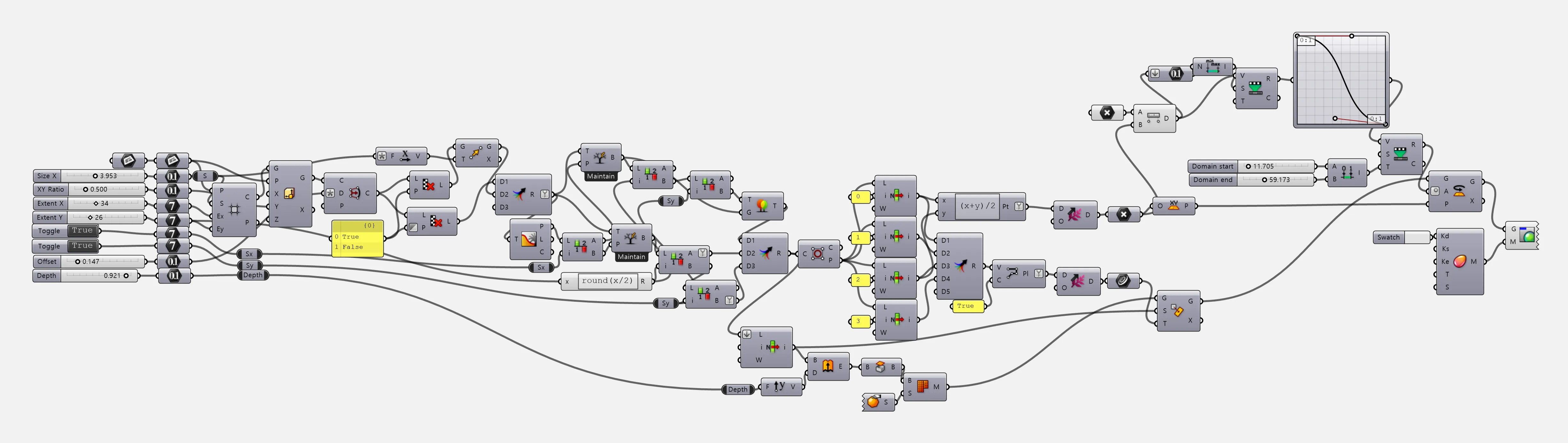 특정 지점과의 거리에 따라 격자 패턴이 유기적으로 회전하거나 크기가 변화하며, 건축 외장 패널 디자인이나 데이터 시각화 패턴을 제작할 때 직관적으로 제어할 수 있습니다.